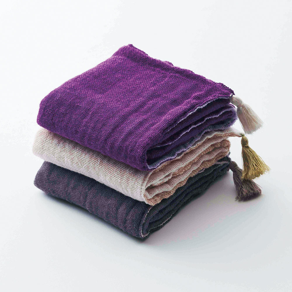 綿100%(蚊帳・2枚重ね)、約37×37cm×3(紫・生成り・銀各1)、房(麻)付 日本製(奈良県)