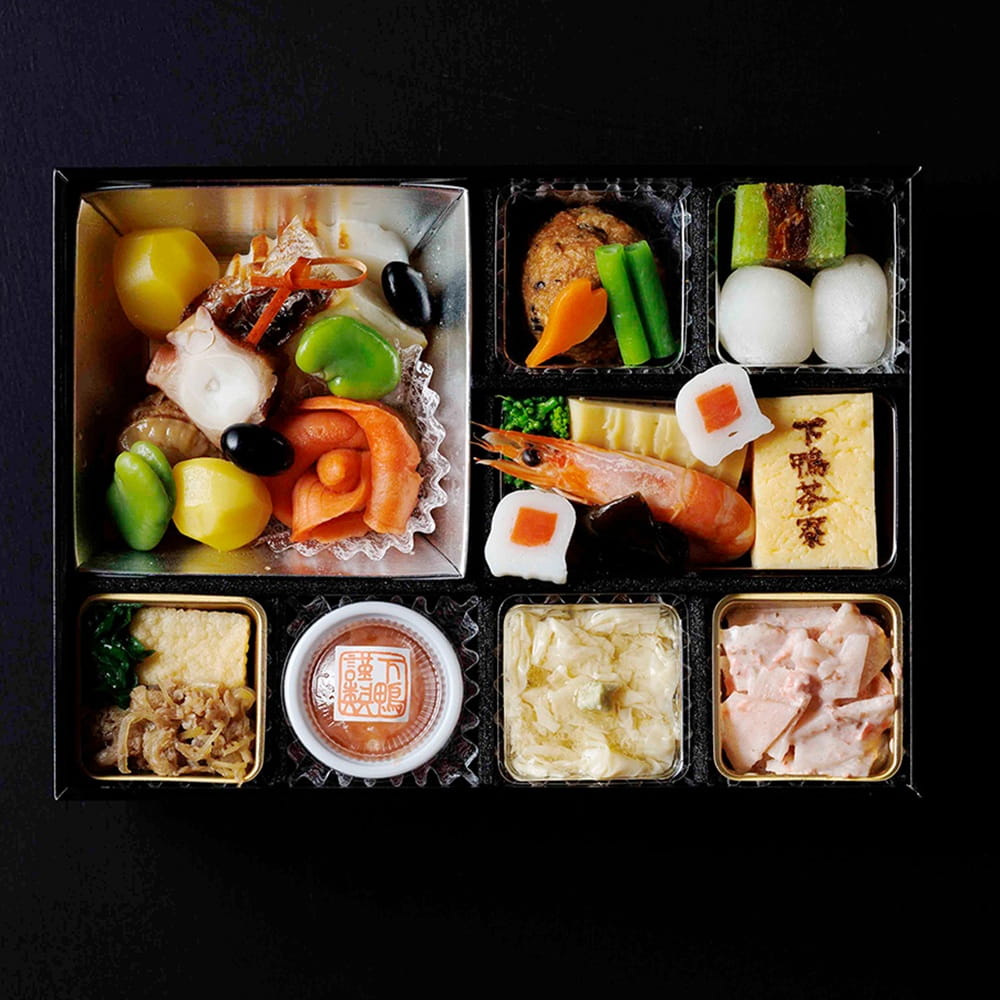 厚焼玉子、カラスカレイ西京焼、飛龍頭煮、ゆばのあんかけ、筍の梅ドレッシング和え、白餡入団子、柚子柿サンド、サーモンフラワー、揚げ豆腐、牛しぐれ煮、栗甘露煮、菜の花ひたし、帆立ひもたらこ雲丹和え、筍煮、アズマニシキ貝煮、にしん昆布巻、海老煮、蒲鉾、蛸旨煮、一寸豆、いんげん煮、黒豆甘露煮、小川巻、人参煮、葱煮、わさび
