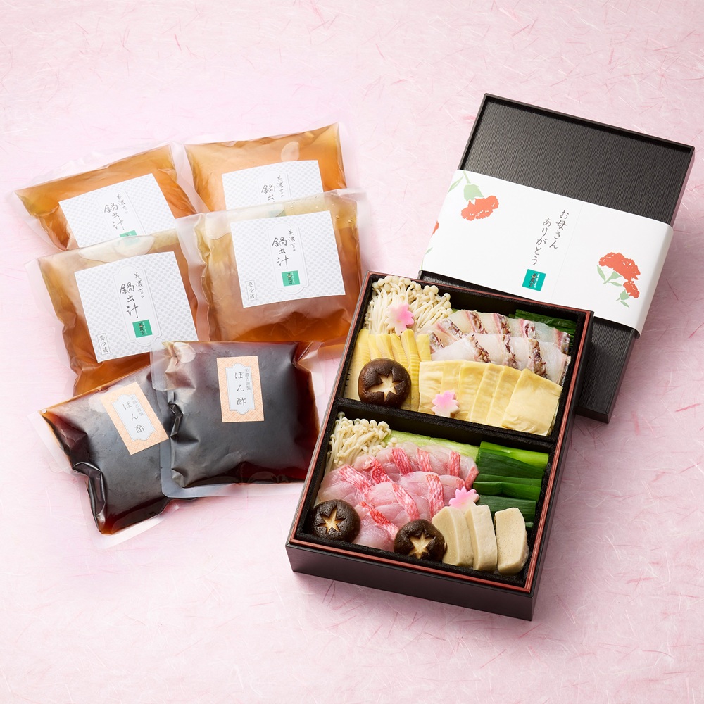 京料理 美濃吉の伝統と技術を引き継いだ料理人が、一つ一つ丁寧に調理した金目鯛と真鯛の紅白のしゃぶしゃぶ鍋です。美濃吉自慢の特製の出汁とポン酢で、母の日にぜひお召し上がりください。