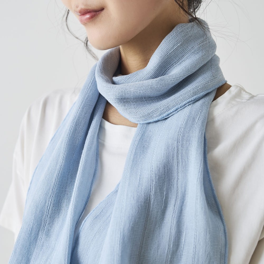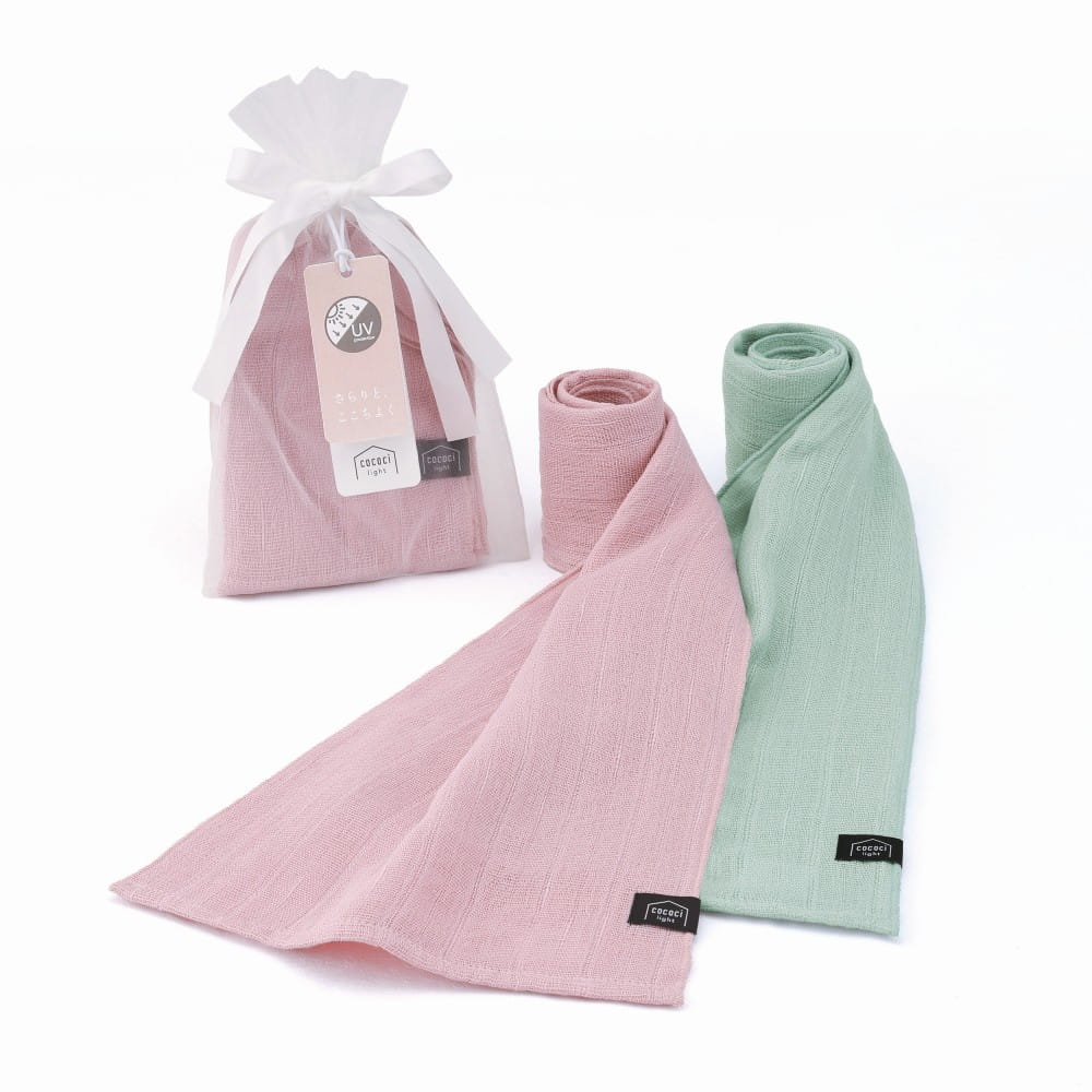 UVカット加工を施した綿100%の二重ガーゼタオルマフラー。夏の日差しが強い日や、冷房対策にもなるので1枚持っていると重宝します。母の日プレゼントに適したオーガンジー巾着袋入れでご用意しました。